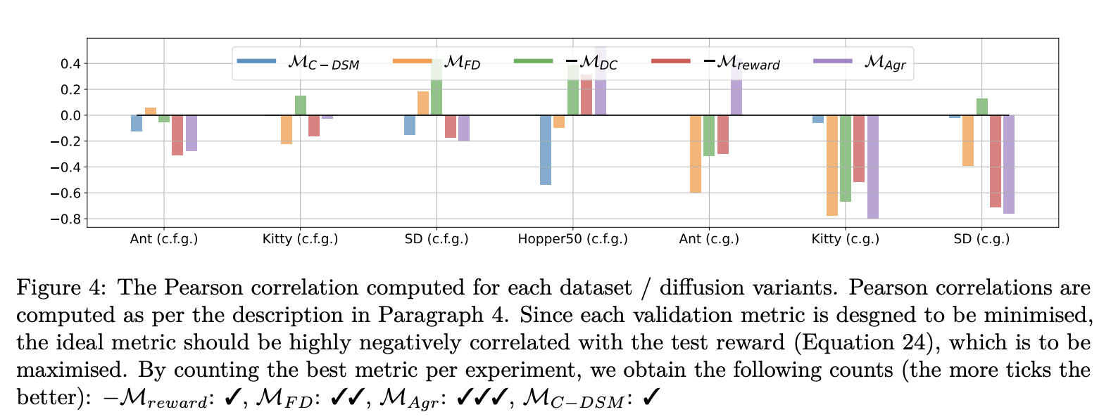 The fundamental question we are trying to answer is: given a list of validation metrics a-priori, which are most useful as substitutes for the reward oracle? We exploited the fact that simulation environments exist – which grant access to the reward oracle – and then measure how correlated they are on four datasets. While this work isn’t about setting new benchmark records, the results are very encouraging (Fig. (7)). That said, it’s worth noting that this correlation is measured on the same data used to select the best metric, so there’s an inherent optimism bias. The ideal thing to do would have been to demonstrate that these metrics perform well on other downstream tasks. (The irony of this is not lost on me, but by the time I realised its significance I was very burned out from the project.)
