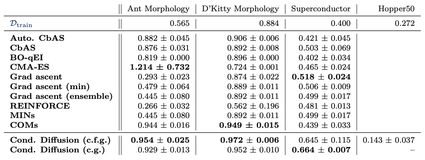 The paper [1] was also tough to write, and honestly, so was this blog post. Maybe it’s because there were just too many ideas bouncing around at once: the importance of using a validation set, how to design that set to test extrapolation, thinking about MBO through the lens of generative modeling, and on top of that, proposing the use diffusion models – which, at the time, hadn’t really been explored in offline MBO. It would’ve been much simpler to just stick to the message of "validation sets, but for extrapolation". But at the time, that felt almost too obvious, like writing a paper just to say that validation sets are useful (which we already take for granted). But things that are supposedly "obvious" sometimes get published and go on to accrue hundreds of citations at the least, so maybe my barometer for that is miscalibrated.