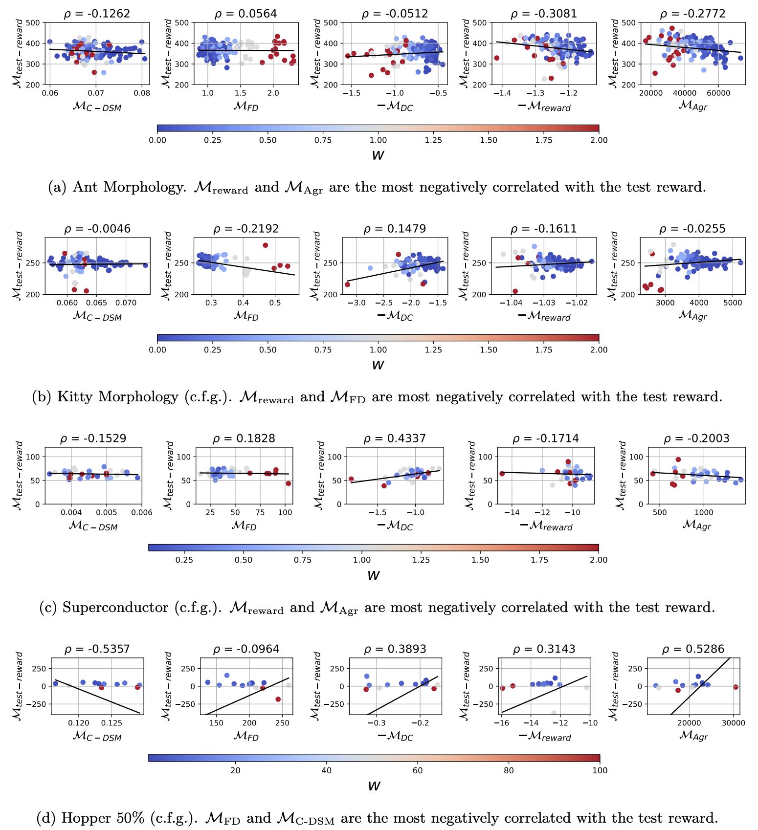 Some metrics are plotted as their negatives (e.g., \(-\mathcal{M}{\text{DC}}\) and \(-\mathcal{M}{\text{reward}}\)) to maintain consistency across all plots. Although these metrics are originally defined to be maximised, we negate them so that all metrics are presented as quantities to be minimised. Since this also applies to the test reward \(\mathcal{M}_{\text{test-reward}}\), the best validation metric is one which is the most strongly negatively correlated with it.