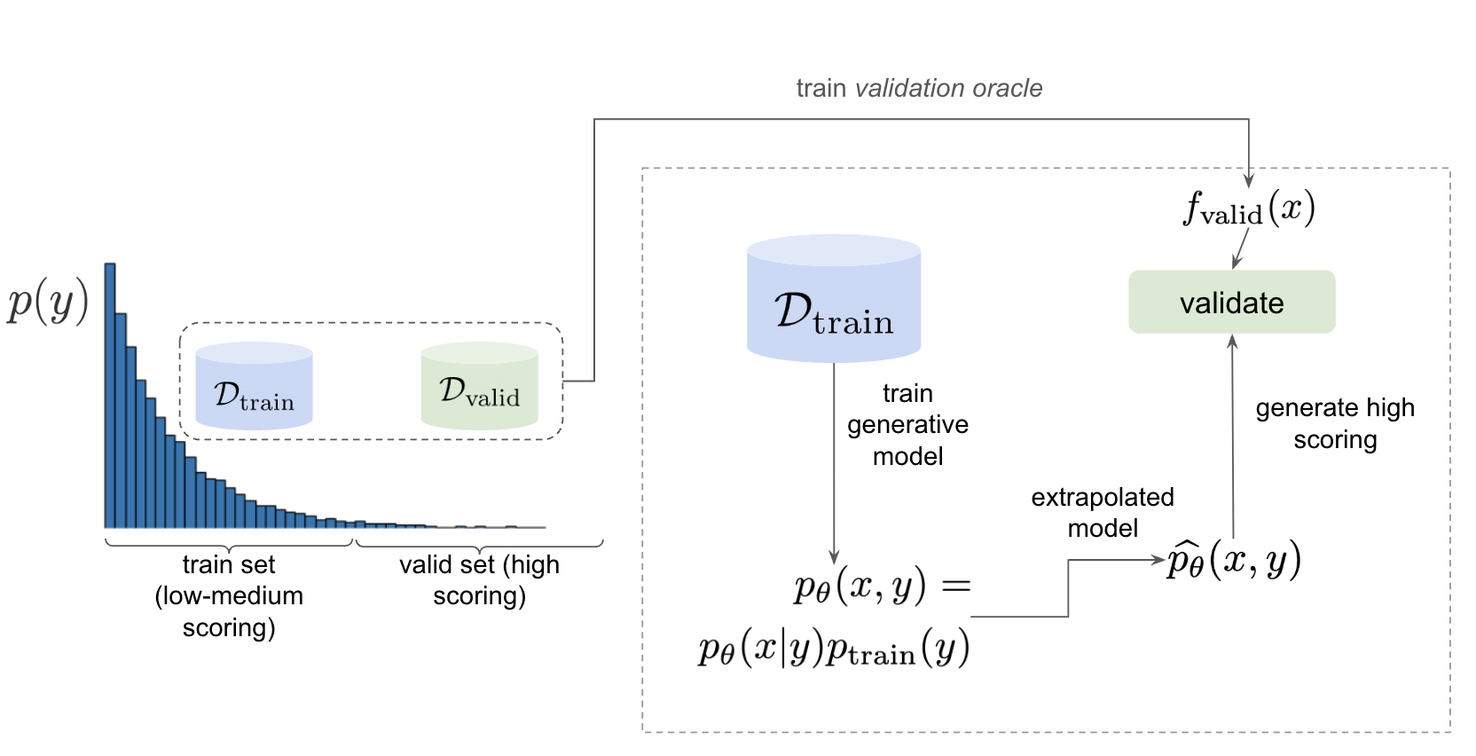 The key idea which seperates MBO from regular generative modelling is that we don't just want to generate any kind of sample from the model. We would like to generate samples whose real reward \(y\) is as large as possible, as these have the most real world utility. The difficulty lies in the fact that these (extremely) high scoring samples do not exist in the training set, otherwise MBO would be a much simpler task where we only need to generate things that plausibly look like what is already in the training set. This means MBO has to extrapolate – it has to learn what constitutes low and medium-scoring samples, and infer what a high-scoring sample may look like.