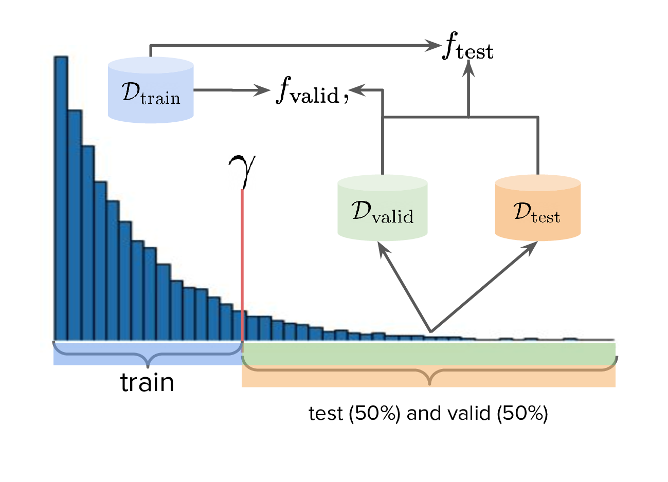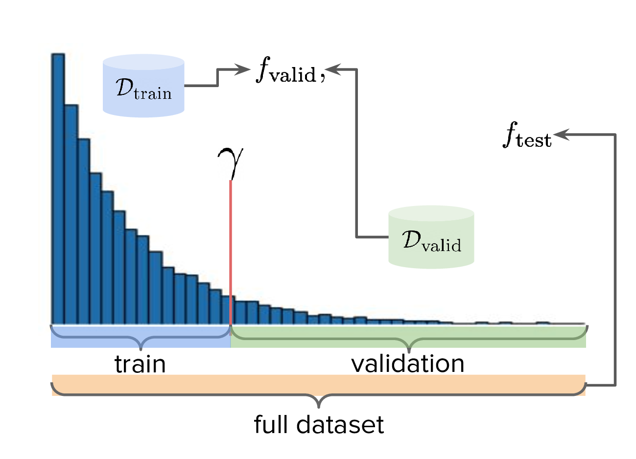 - (2) Define that all samples whose \(y \gt \gamma\) belong to the validation set (Fig. 1, right). Since the validation proxy \(\fvalid\) is always trained on the combined train+valid split, this means it is trained on the full dataset. This technique does not respect the intended design of the library, even if its motivation is quite principled.